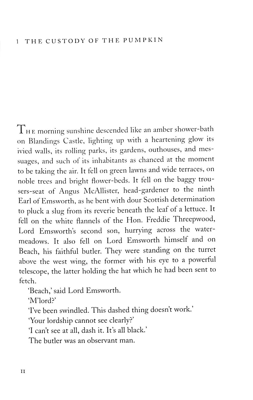 The master of Blandings is, nominally at least, Lord Emsworth. Clarence, the ninth Earl, is an amiably absent-minded old chap, who is charming because of his slow, relaxed lifestyle and the simple obsessions that make him oblivious to the absurd melodrama of his family, namely his home, gardens, pumpkins, and his champion pig, Empress of Blandings. He is never happier than when pottering about the grounds on a fine sunny day.